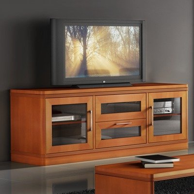 | FT72TRLC Finish: Light Cherry Shown in Light Cherry Finish Features: -Solid wood fluted edge detail.-Smoked, tempered-glass doors, framed in solid wood.-Radius corners.-Center channel speaker drawer.-Media storage drawer.-Internal wire management.-Ventilated back panel.-Perfect for DLP, Plasma, LCD TVs.-Ships fully assembled.-Call our friendly customer service team for wood samples.-Wood samples available upon request. Please contact sales@ or call toll free !. Options: -Available in Light Cherry and Wenge finishes. Color/Finish: -Due to color variance in the product finish, actual TV stand finish may differ from image. Dimensions: -Overall Dimensions: 70 W x 17.7 D x 26 H.-Interior Dimensions for Center Channel Speaker Drawers: 8.3'' H x 26.18'' W x 14.9'' D. ...Read more |