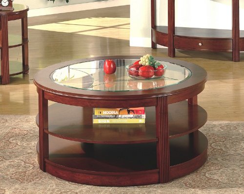 - Contemporary Style Cherry Finish Round Coffee Table with Glass Top.